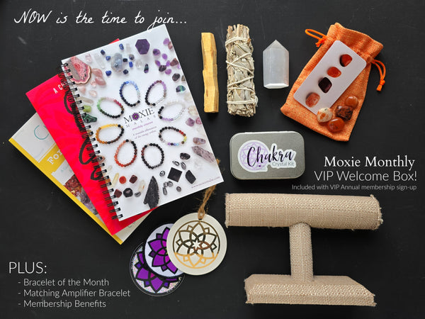 A monthly ritual of intention, energy, and empowerment. Each delivery includes a handcrafted crystal bracelet and a loose stone—tools for healing, alignment, and personal growth. Choose month-to-month or VIP annual membership and receive exclusive designs, bonus gifts, and access to our Moxie Masterclass community.